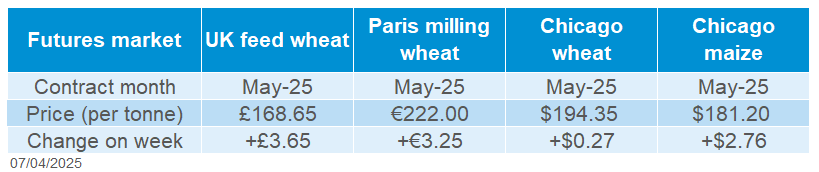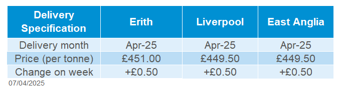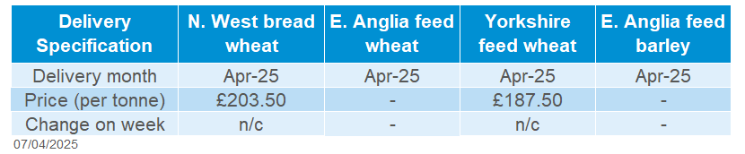 Domestic delivered wheat prices up in line with futures prices from Thursday to Thursday. Bread wheat for delivery in Northamptonshire for May 2025 was quoted at £197.00/t, up £1.50/t. Yorkshire delivery was quoted at £202.50/t, up £3.00/t.