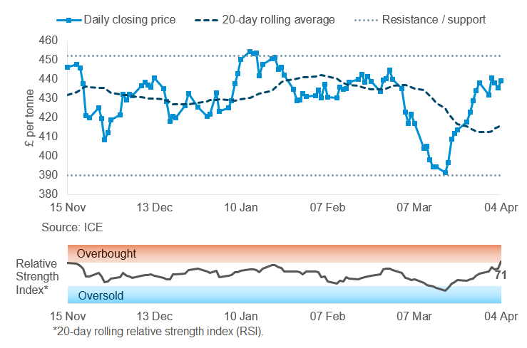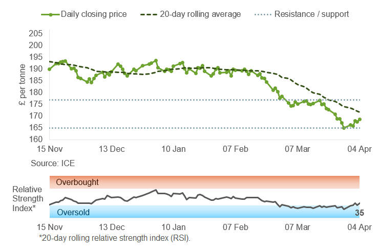 In £/t terms, May-25 Paris rapeseed futures continued to trade between the 20-day moving average and resistance level of £452/t last week (Friday to Friday). This could limit upward movements in the short term, depending on wider market and currency developments.
