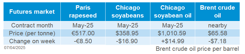 Old crop Paris rapeseed futures (May-25) closed at €517.00/t, down €8.50/t from the previous week, while the Nov-25 contract dropped €11.00/t, ending at €478.25/t. This decline followed Chicago soybean futures, which fell 4.5% for May-25 and 4.4% for Nov-25 contracts.