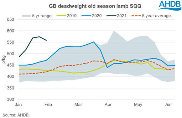 In the week ending 30 January, the OSL SQQ deadweight lamb price dropped back by 15.9p on the previous week to average 558.4p/kg. Despite this change in market direction, prices are still up by 87p on the same week last year and 138p higher than the five-year-average.