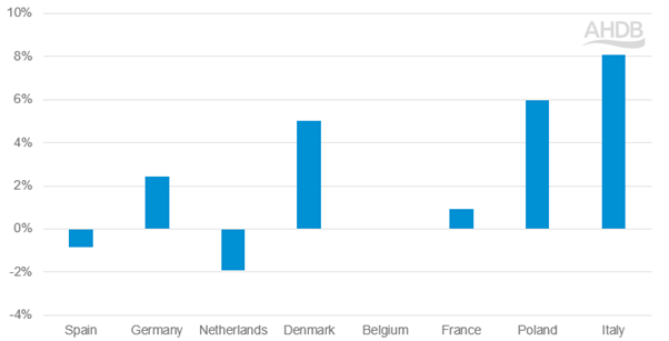 This more modest increase in slaughter numbers compared to production has been reflective of the increase in weights at slaughter across all major producers, year-on-year. This was particularly significant outside of the top two producing nations (Spain and Germany), with France, Poland and Denmark recording an increase in kg/head of 1.0kg, 2.1kg and 3.9kg respectively.