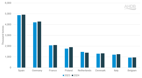 Poland saw the most growth, increasing their production by 7.7% representing an increase of 136,000 tonnes for 2024. Most major producers saw steady growth, Spain up 1.0% and Germany up 1.7%, however the Netherlands saw notable reductions in production, down 5.2% representing a fall of 76,000 tonnes.