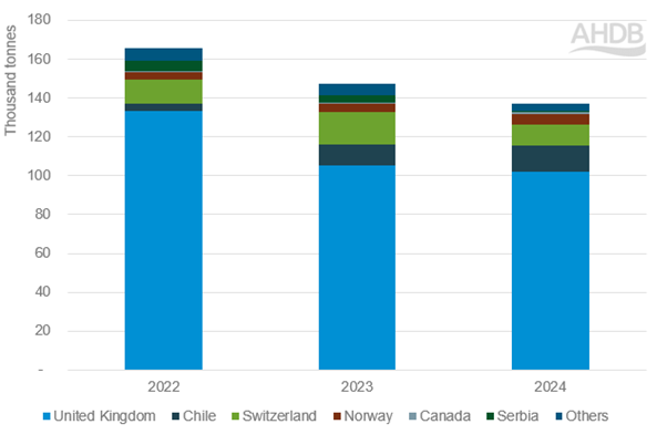 2024 import volumes from outside of the EU totalled 137,000 tonnes, down by 7.3% from 2023. The main importers to the EU remain the UK (75% of total volume), Chile (10%) and Switzerland (8%). Imports from the UK however were down 2.7% in 2024 compared to 2023, likely a combined impact of improved EU domestic supply and the increased price differential making UK pig meat less attractive.