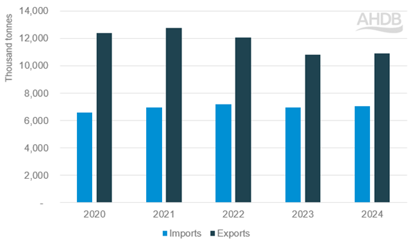 Total EU pig meat (including offal) imports slightly increased in 2024 compared to 2023 reaching 7.03m tonnes (+1.2%) however this is still below 2022 levels by 2.1%. Exports also increased in 2024 compared with 2023 by 1% however this is still significantly lower than 2022 (-9.5%).