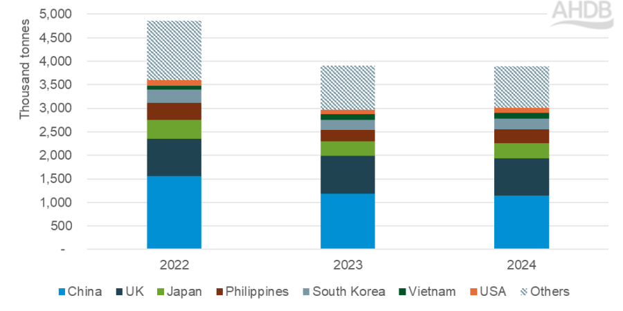 Exports outside of the EU of pig meat including offal totalled 3.9m tonnes in 2024, down 0.3% compared to 2023. China remained the number one destination for pig meat outside of the EU, however shipped volumes reduced by 47,000 tonnes (-3.9%). The majority of this volume was made up of frozen offal (53%).