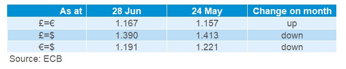 From 24 May to 28 June, sterling marginally gained against the euro, but fell against the US dollar.