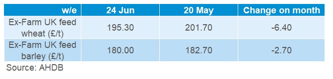 In June, we saw global grain markets decline as more favourable weather started to ease new-crop supply concerns. Though as we can see, spot UK ex-farm feed wheat prices lost more ground than barley prices. The discount of barley to wheat narrowed by £3.70/t to £15.30/t. This reflects tight UK barley availability as we approach the end of the season.