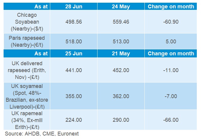 With a tight supply picture for rapeseed, prices remain at a premium to other oilseeds. Despite large falls in soyabean prices in June, rapeseed has seen some support. This is from dry and hot weather in Canada causing supply concerns.