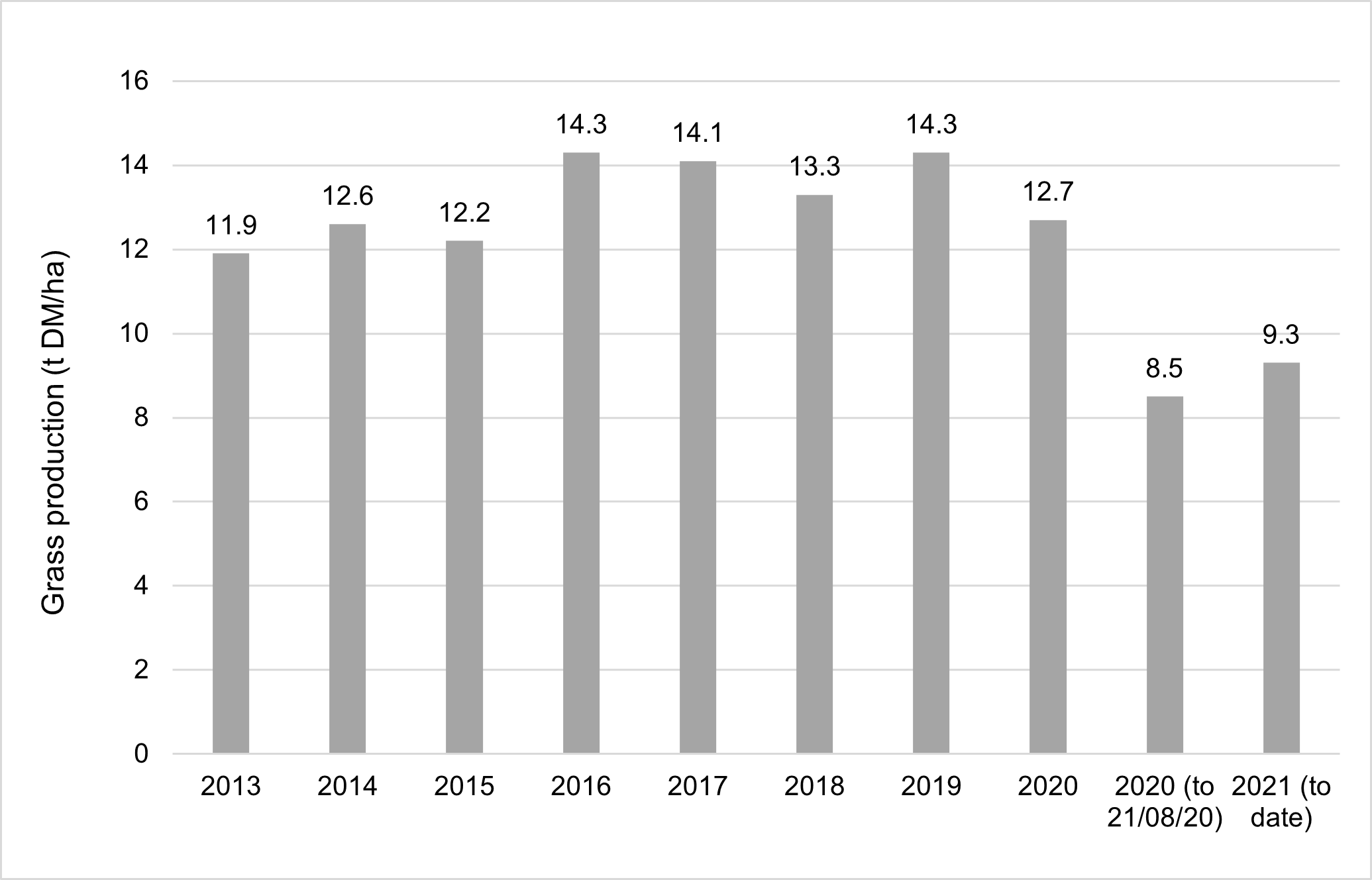 Annual grass production has increased steadily, above the 11.9 t DM/ha reported in 2013, but drops were reported in 2018 and 2020 to 13.3 and 12.7 t DM/ha respectively. Last year’s grazing season brought a mixture of challenging conditions from the heavy rain and flooding in early spring, followed by a hot and dry summer leading to drought in some areas.