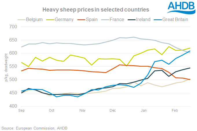 To put the deadweight prices above in context, in the week ending 21 February the French reference price for heavy lambs was £6.03/kg, while its GB equivalent was £6.09/kg. Supplies are reported to have been relatively tight on the continent, which has in turn been a driving force behind price movements here. However, more recently, prices in France have been falling. If this continues, in conjunction with any further weakening in the Euro/GB exchange rate, it could spell weakness for the GB market.