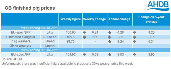 Finished pig prices rose again in the latest week, despite facing increasing headwinds. In the week ending 24 July, the EU-spec SPP lifted 0.24p to average 160.90p/kg.