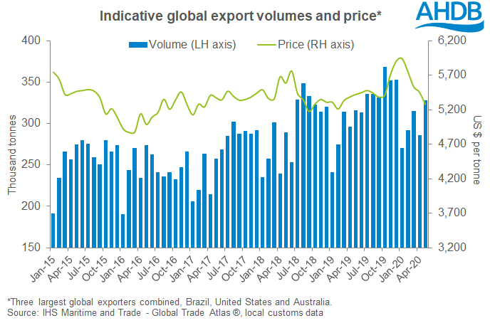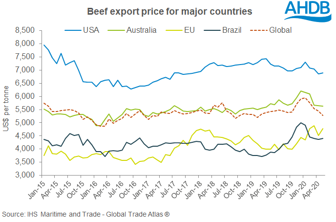 Despite starting the year in a strong position, prices for these exports have been falling during 2020. The average price of these countries’ combined exports in May was 5,280 USD/tonne, 3% lower than in May 2019. Only the US reduced its export volumes year on year in May, the 31% decline (-27,000t) was across most destination countries, but Japan and South Korea in particular. This decline was more than offset in volume terms, by Brazil (32,000t) and Australia (7,000t), albeit at lower prices to markets like China. Australia increased exports to both Japan and China. The US typically exports higher value beef than Brazil and Australia, and although this will be influencing the global price, export prices have been falling for all three countries.