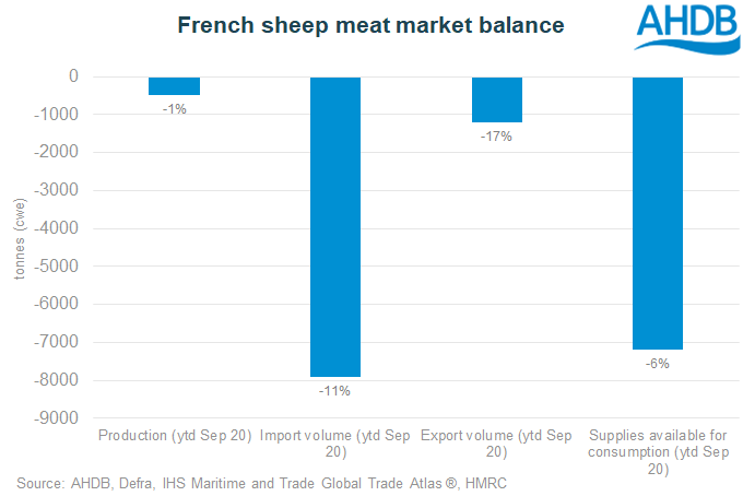 Unlike the UK, France exports very little lamb and typically imports about half of its needs. French sheep meat production in the year to September has been 63,700 tonnes, 1% less than at the same point in 2019. France is the single most important export market for UK lamb, as the destination for around 40% of our exported sheep meat, predominantly in the form of whole or half carcases.