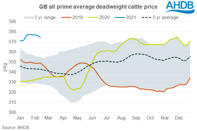 In the week ending 13 February, the GB all prime average cattle price dropped down by 2.4p on the previous week to average 374.4p/kg. The measure is now above the price achieved for the same week last year by 41.1p/kg.
