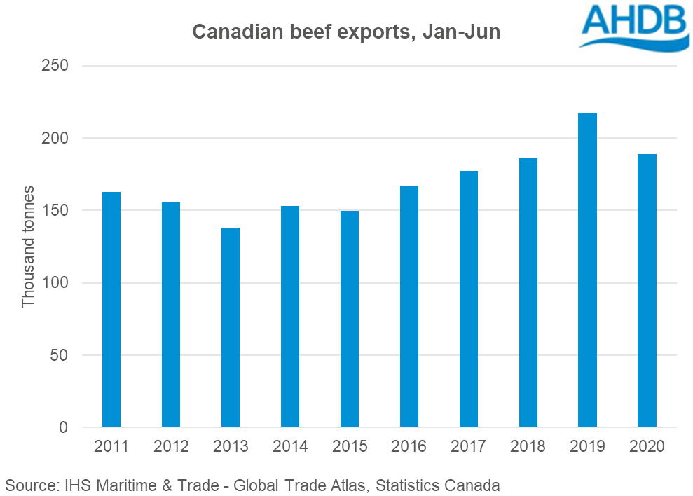 Canadian beef exports (incl. offal) for January-June were down 13% year-on-year at 188,800 tonnes, mainly due to lower trade into the US and China. Exports of live cattle and calves into the US were also down 10% during the period, due in part to coronavirus disruption at US plants, causing backlogs and reducing demand for Canadian imports. Exports of beef recovered somewhat in June, helped by increased shipments to the US, however volumes were still down in relation to last year.