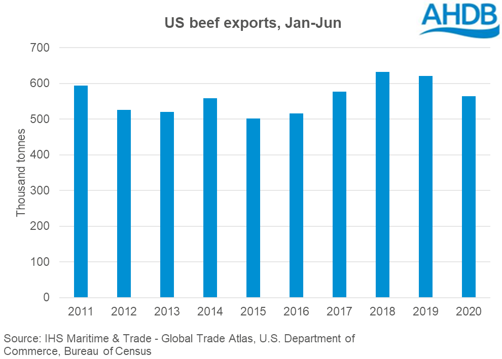 US beef exports (incl. offal) for the first six months of the year were down 9% from 2019 at 564,900 tonnes. Shipments have been struggling particularly during May-June, reflecting coronavirus-induced disruption of meat production, foodservice, and the economies of major importers. During the period, volumes fell to most key markets, but were higher year-on-year to Canada, China and South Africa. Industry reports suggest that a cheapening of the US dollar will have provided some support to exports.